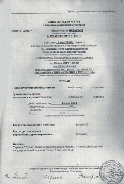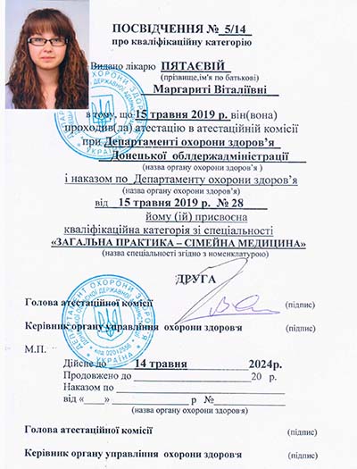 • В мае 2019 года прошла аттестацию в аттестационной комиссии при Департаменте здравоохранения Донецкой облгосадминистрации с присуждением квалификационной категории по специальности "Общая практика –семейная медицина".