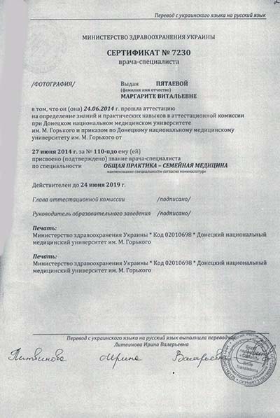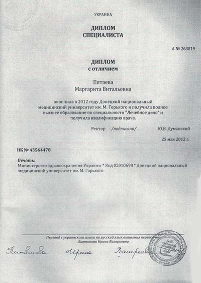 •  В 2012 году Пятаева Маргарита Витальевна окончила с отличием обучение в Донецком национальном медицинском университете им. М. Горького по специальности "Лечебное дело" и получила квалификацию врача.